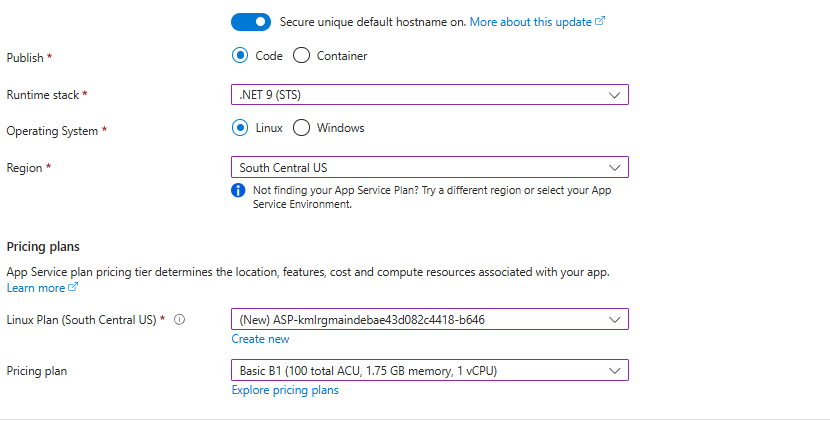 I don’t see any error here, so I’m not sure what’s going wrong. The region is probably OK, since “South Central US” is one of the regions we do support. But you may be asking for an SKU that won’t don’t support for the App Service, perhaps.