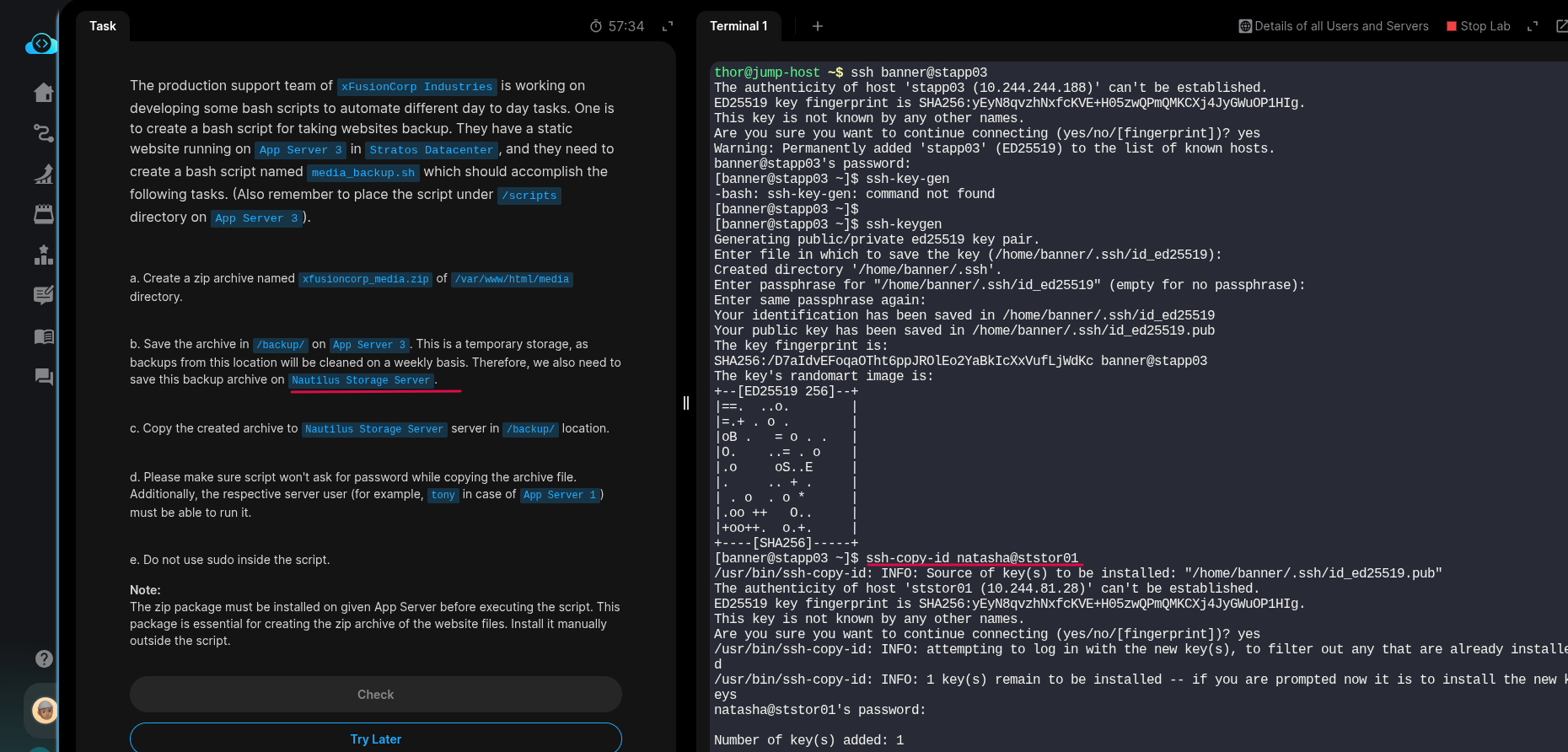I retried this lab, and I had misread the server hostname as stbkp01 for Backup Server. But the task requires you to copy the script to Storage Server, so you can try with ststor01 and use it’s password.