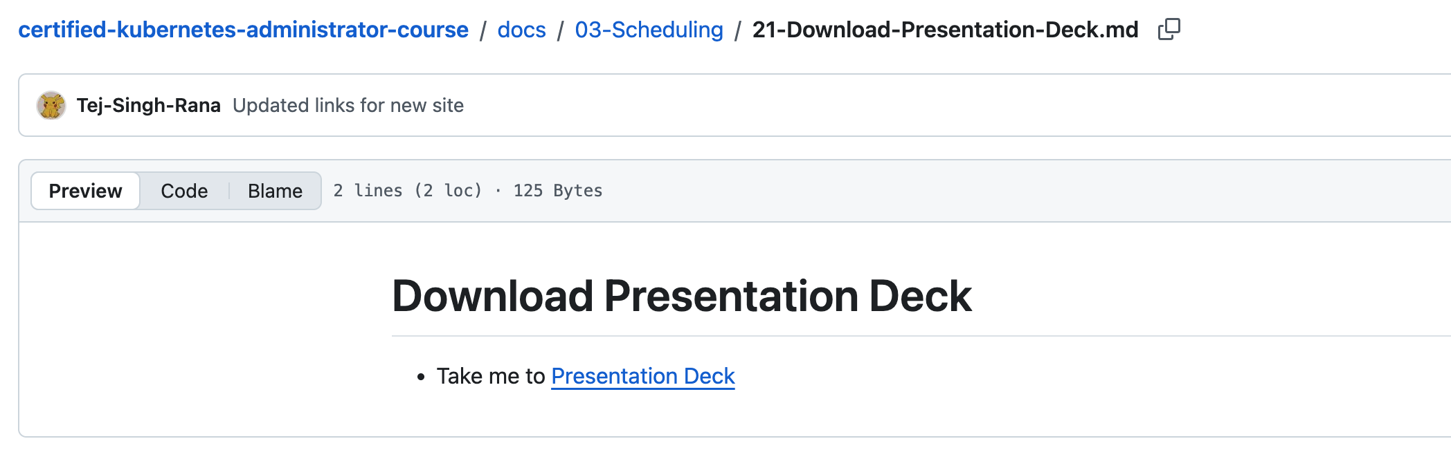 Hi, I have enrolled to this course in Udemy: Certified Kubernetes Administrator (CKA) with Practice Tests and I am trying to get the slides document to refer but I am unable to find the exact location. Github takes me to this link which redirects to the home page of Udemy. Could someone please help me get the materials please.