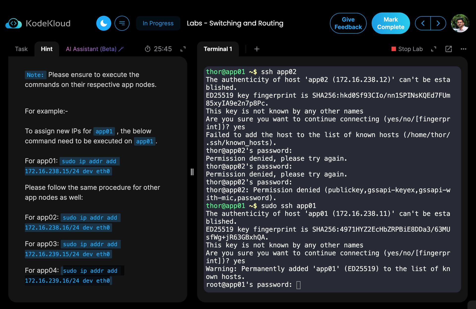 Your problem here is that you are on app01, and not on the jump host. The jump host is configured to ssh into all of the other hosts w/o a password, because the jump host’s key is deployed on the app hosts. But the app hosts are not similarly configured; their keys are not deployed on the other hosts. So to ssh from app01 and other app hosts, you need to know a password. Which you don’t know in this lab.