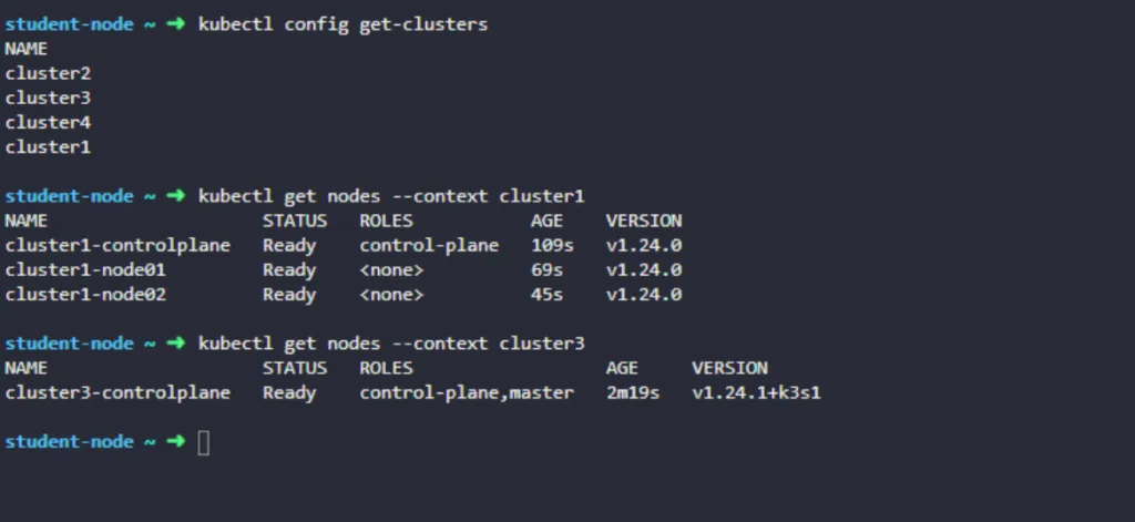 By default, the exam taker will be logged in to what is called the student node. From here, you will be able to access all the other Kubernetes clusters and also be able to SSH to the nodes of these clusters.