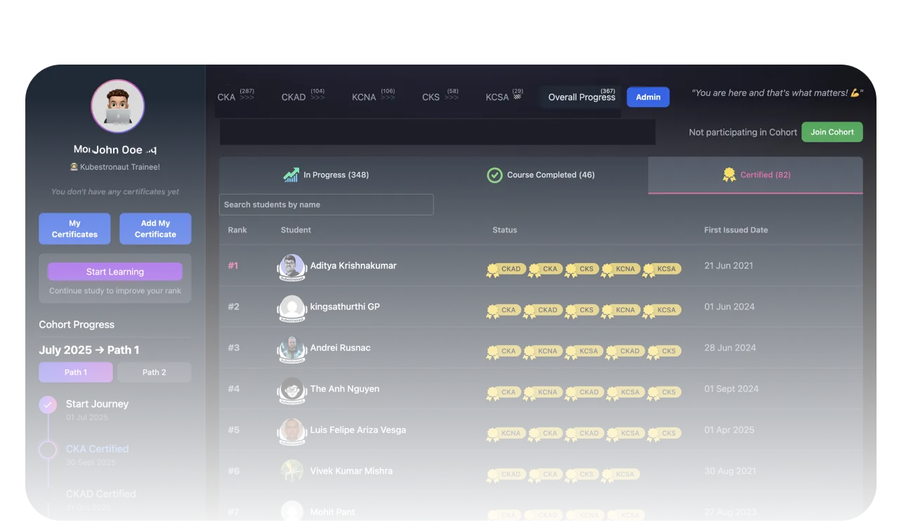 The Golden Kubestronaut cohort focuses on the 10 additional certifications beyond the 5 core Kubernetes certifications (CKA, CKAD, CKS, KCSA, KCNA).If you wish to prepare for any of these five core certifications, please join the our Kubestronaut cohort.