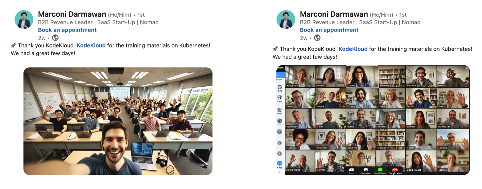 1. Credit: Ensure you give appropriate credit and attribute the training materials as per the Creative Commons Attribution-NonCommercial 4.0 International License. β β2.Share: Post a selfie of your training session on social media and tag us @KodeKloud.